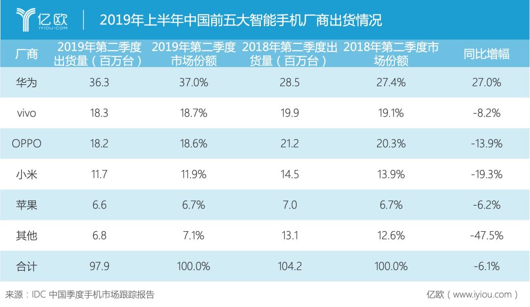 在5G还未普及,手机市场逐渐疲软的行业背景下,华为上半年卖出了1.18亿部手机,同比增长24%,消费者业务的营收占比也到达了55%。根据IDC公布的第二季度中国智能手机出货量,除了华为逆势增长27%稳居第一外,紧随其后的vivo、OPPO、小米和苹果有着6.2%到19.3%不等的跌幅。