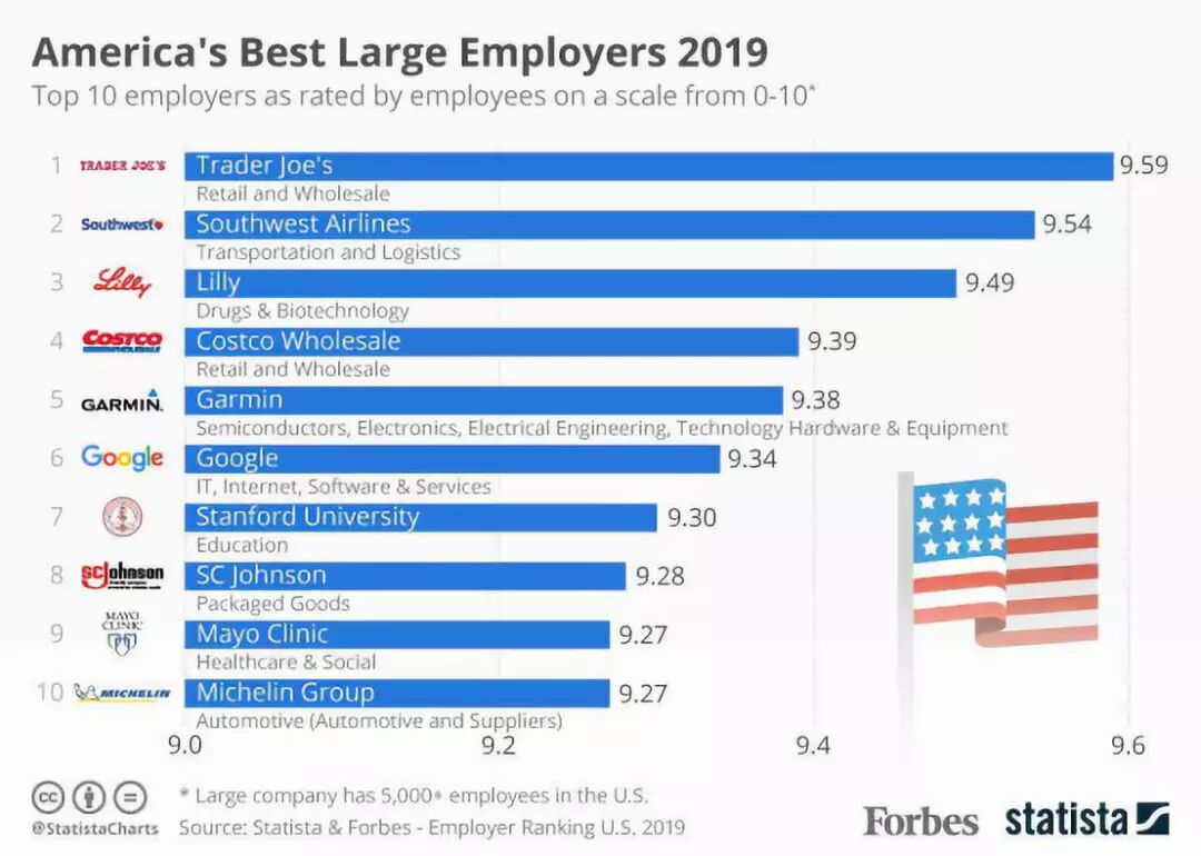这一系列的努力,自然得到了回报。据福布斯和Statista的报告显示,在2019年美国最佳雇主中,西南航空排名第二,也是唯一一家进入前十的航空公司。