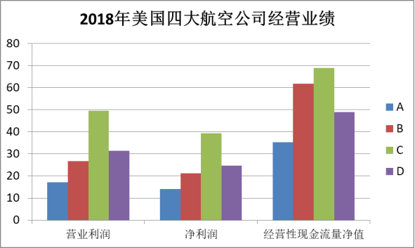 这是2018年美国四大航空公司:美国航空、联合大陆、达美航空、西南航空的部分财务指标。从图中不难发现,在营业收入、总资产及总负债方面,D与A、B、C完全不是一个重量级的。