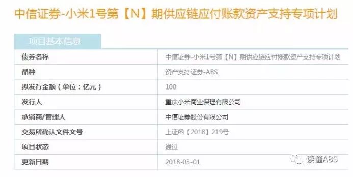 3月2日,小米公司供应链金融资产支持证券100亿元储架发行取得上海证券交易所无异议函,成为国内首单支持新经济企业供应链金融的资产支持证券,首期拟发行规模5亿元。此单项目的成功推出,是上交所在证监会的统一领导下,贯彻落实支持新经济发展,推动供应链金融服务实体经济的重要举措。